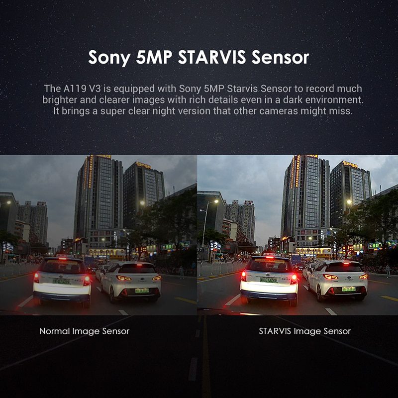 The A119 V3 is equipped with Sony 5MP Starvis Sensor to record much brighter and clearer images with rich details even in a dark environment. It brings a super clear night version that other cameras might miss.