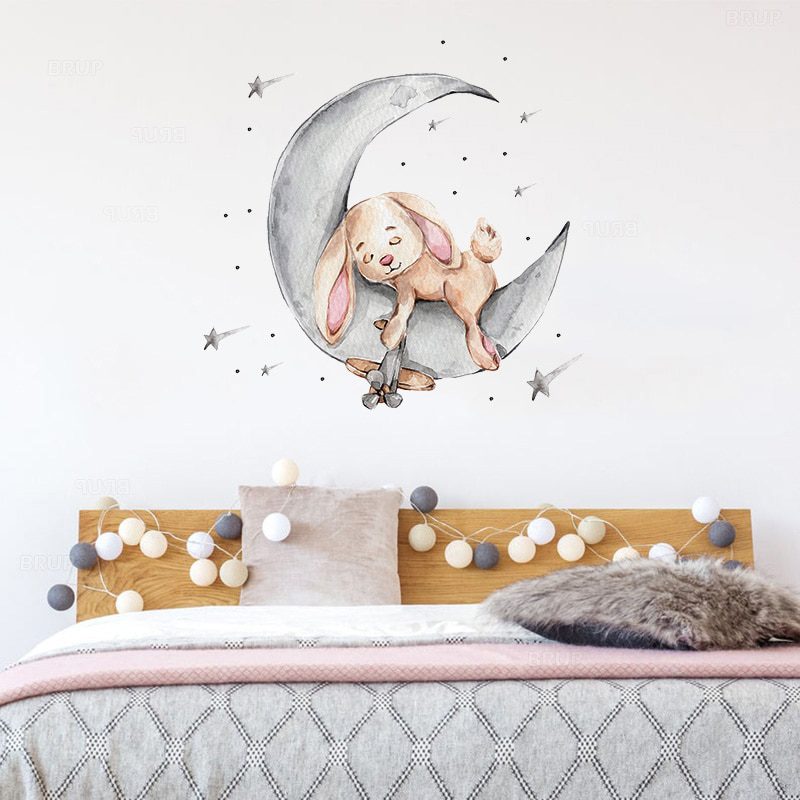 Cartoon Bear Bunny Sleeping on the Moon and Stars Wall Stickers