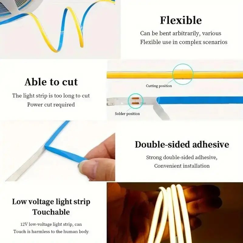 Elevate your space with the USB 5V COB Led Strip Light. This innovative lighting solution brings a perfect balance of brightness and flexibility to your environment.