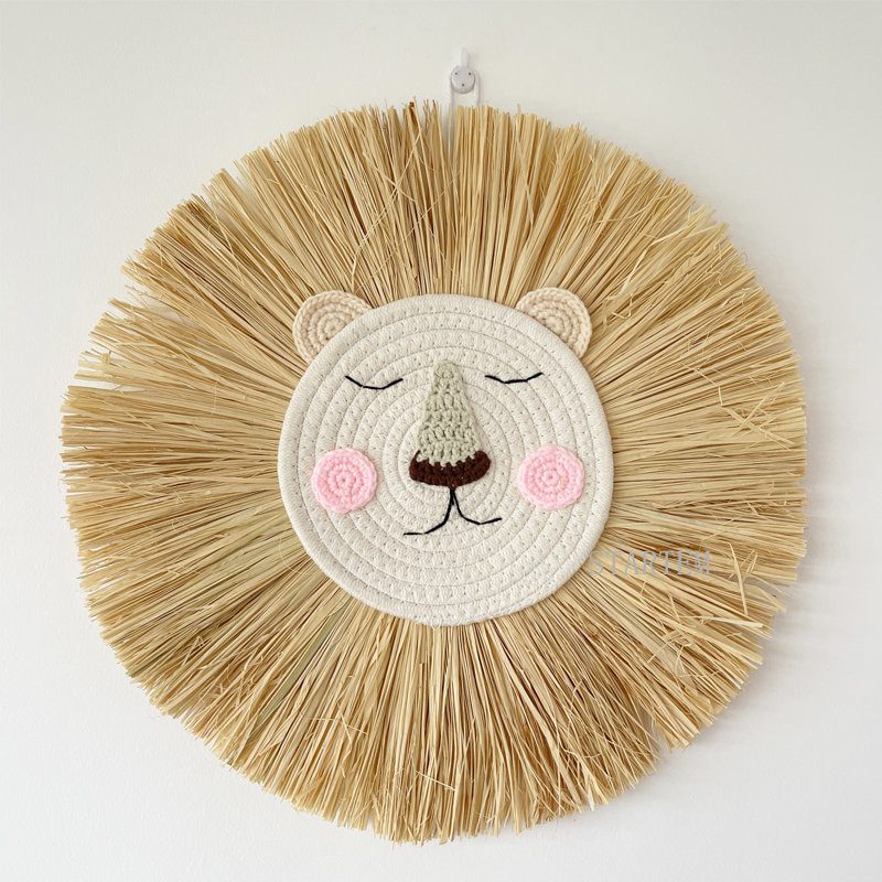 INS Nordic Handmade Lion Wall Decor Cotton Thread Straw Woven Animal Head Wall Hanging Ornament for Nursery Baby Room Decoration