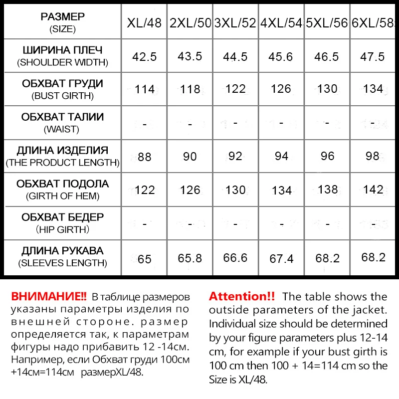 Delivery is not very fast, almost 2 months. On the OG 120 growth 164 took 6XL. I love it more freely, I really liked it. Deep hood. On the sleeves inside are knitted cuffs. Pockets are deep. The coat is warm, however, the air does not pass, if you actively move or go into a warm room, then the whole body is washed. And it is also heavy compared to a real down jacket. 1,750 kg. But for this money you can accept it.