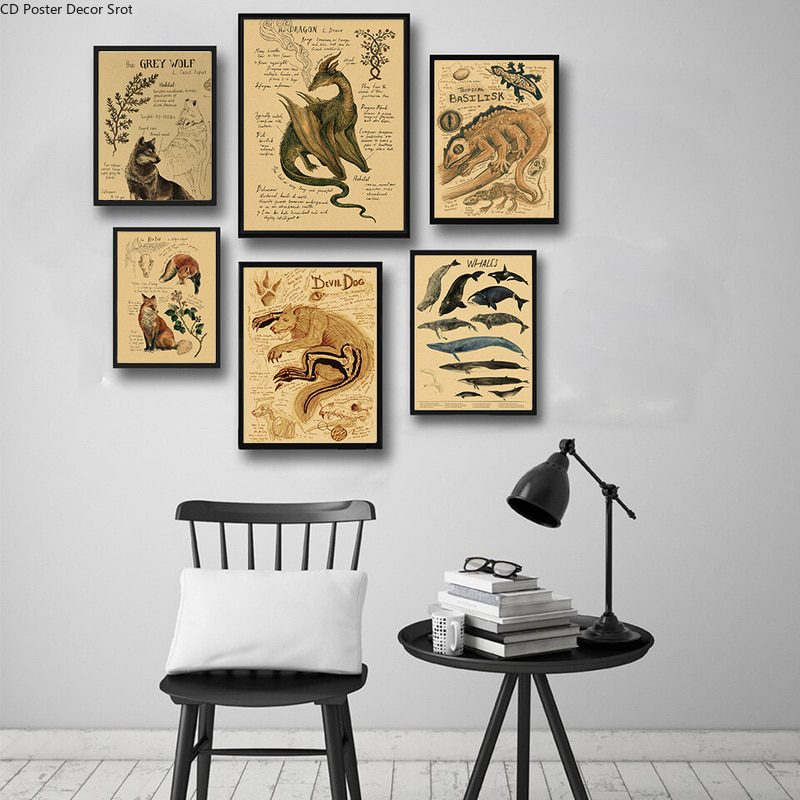 Natural Study Dragon/Tropical Basilisk/Phoenix/Fox/Dog/Wolf/Whale Print Poster Kraft Paper Vintage Home Room Decor Wall Painting