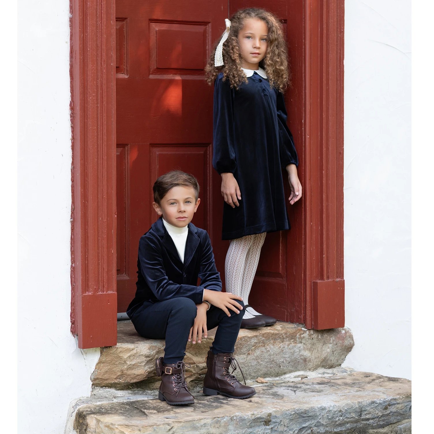 • Navy velvet dress, baby girls’ set, girls’ velvet skirt, and navy velvet blazer made from high-quality velvet